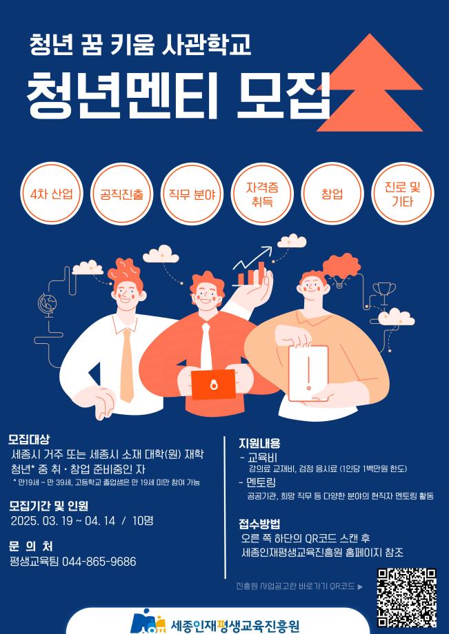 취업과 창업을 준비하는 과정에서 실무 경험, 네트워크, 전문가 멘토링이 있다면 훨씬 더 수월하겠죠? 😊 세종특별자치시에서는 청년들의 성공적인 사회 진출을 돕기 위해 ‘청년꿈키움사관학교’ 멘티를 모집하고 있어요!